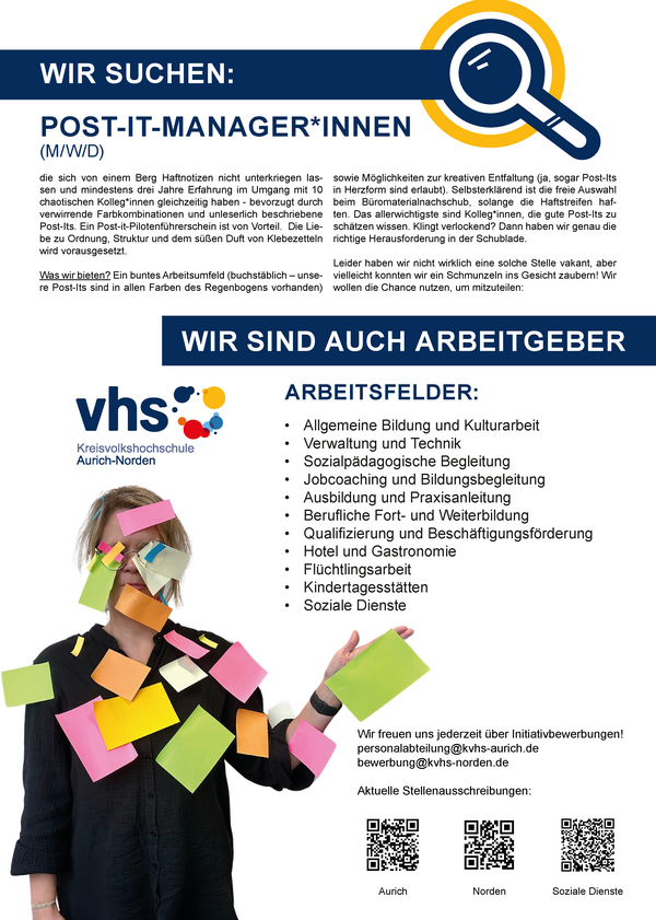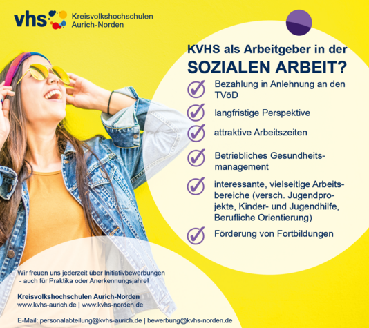 Auf dieser Seite finden Sie Stellenangebote der Kreisvolkshochschule Aurich-Norden gGmbH am Standort Norden.